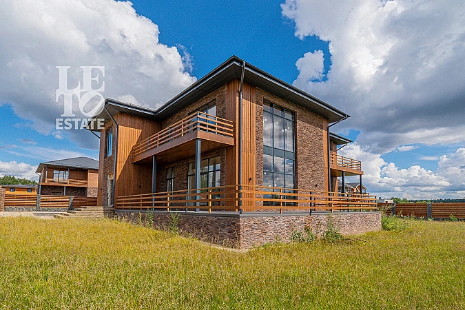 Архитектурный стиль дома включает просторные геометрические формы, панорамное остекление, создавая атмосферу гармонии и естественности.