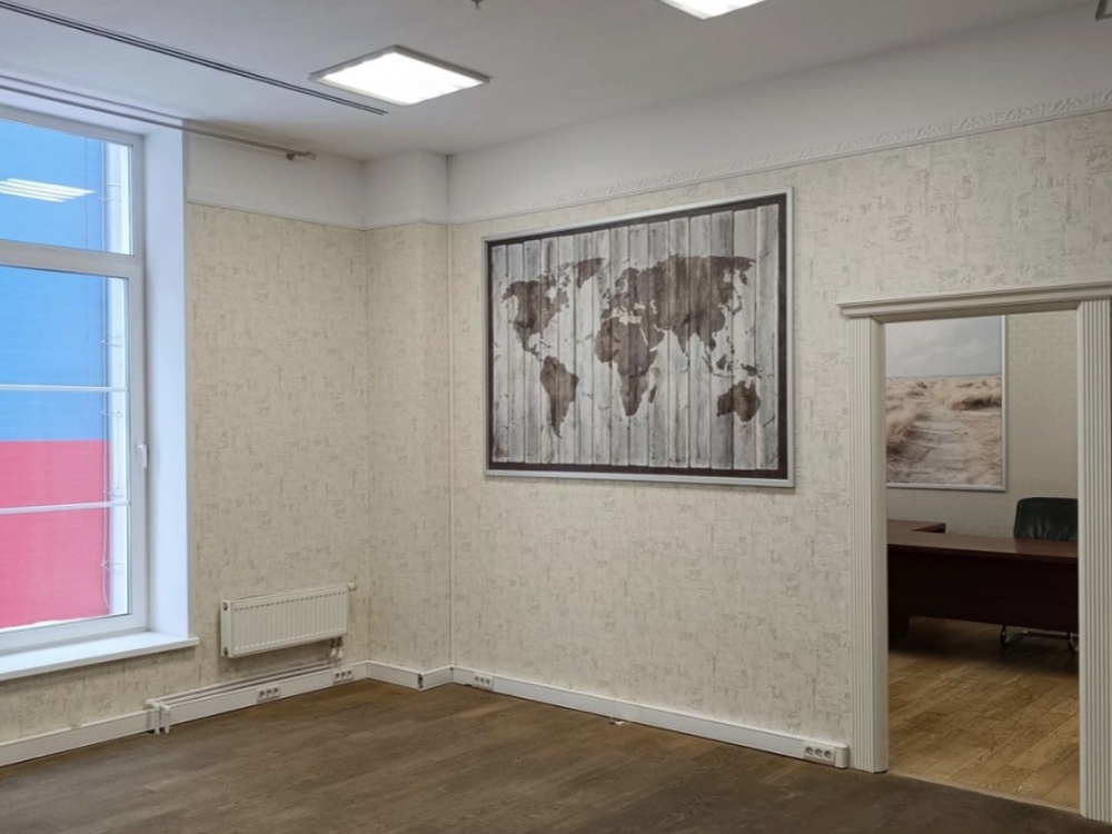 . Офис расположен на третьем этаже, качественный ремонт, кабинетная планировка. В помещении приточно-вытяжная вентиляция, кондиционирование, высокие потолки и много окон.