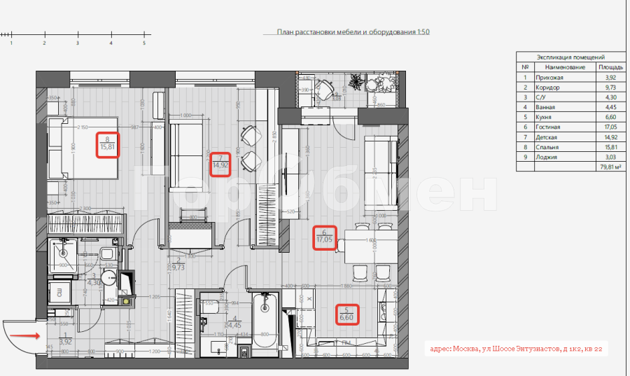 Общая площадь: 79,3м, по комнатам: 15,81м-14,92м, кухня-столовая: 23,65м