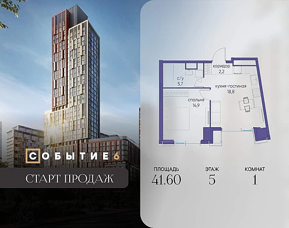Продаётся 1-комнатная квартира от застройщика: общая площадь 41.60 м, жилая 14.90 м, кухня 18.80 м, 5-й этаж, жилой квартал «Событие-6», корпус 2 (секция 5) Срок сдачи: 1 квартал 2029 года.