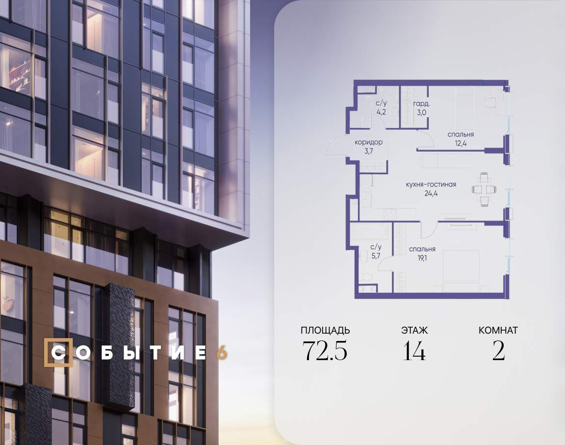 Продаётся 2-комнатная квартира от застройщика: общая площадь 72.50 м, жилая 31.50 м, кухня 24.40 м, 14-й этаж, жилой квартал «Событие-6», корпус 2 (секция 1) Срок сдачи: 4 квартал 2029 года.