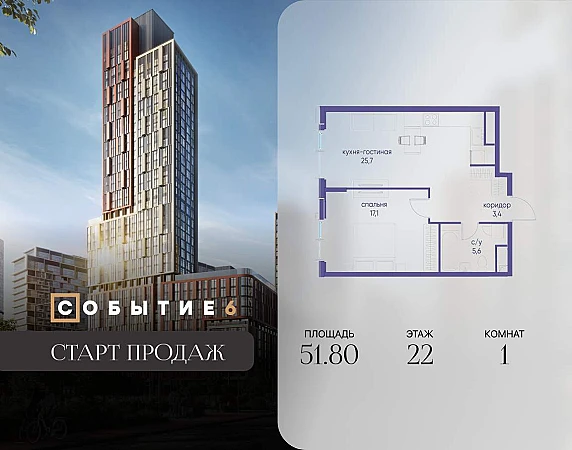 Продаётся 1-комнатная квартира от застройщика: общая площадь 51.80 м, жилая 17.10 м, кухня 25.70 м, 22-й этаж, жилой квартал «Событие-6», корпус 2 (секция 1) Срок сдачи: 1 квартал 2029 года.