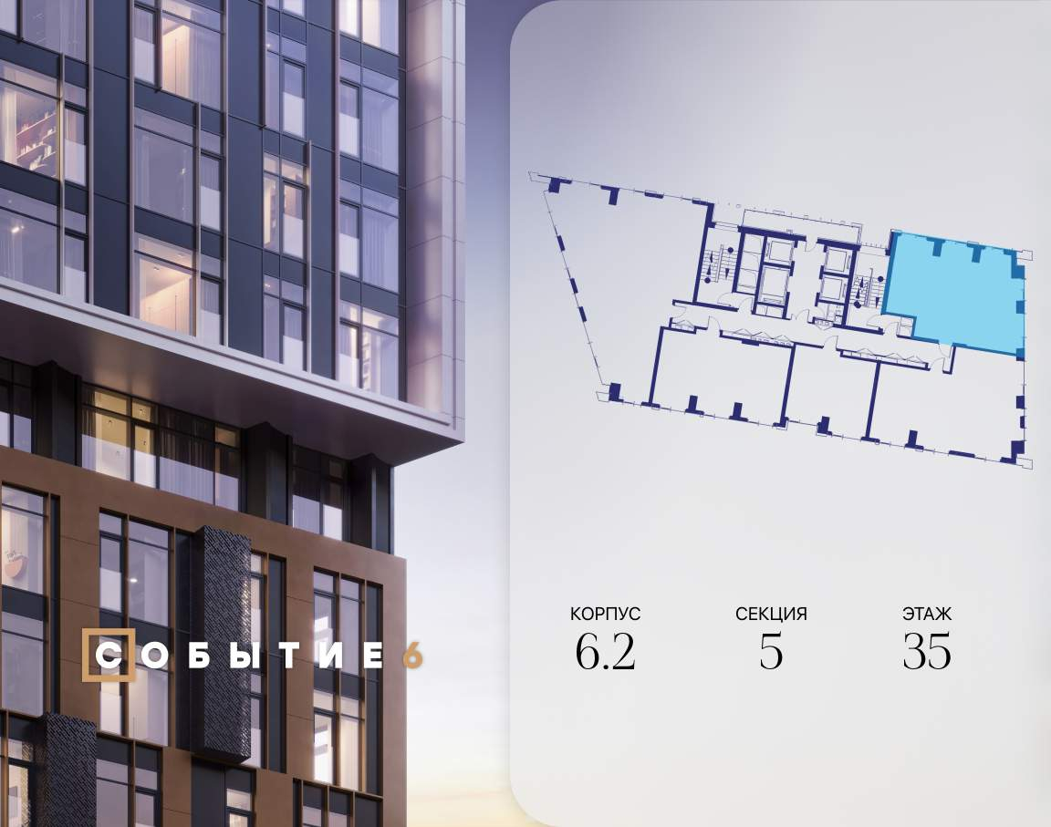 Продаётся 3-комнатная квартира от застройщика: общая площадь 77.10 м, жилая 41.90 м, кухня 17.70 м, 35-й этаж, жилой квартал «Событие-6», корпус 2 (секция 5) Срок сдачи: 4 квартал 2029 года.