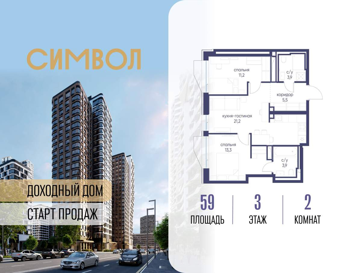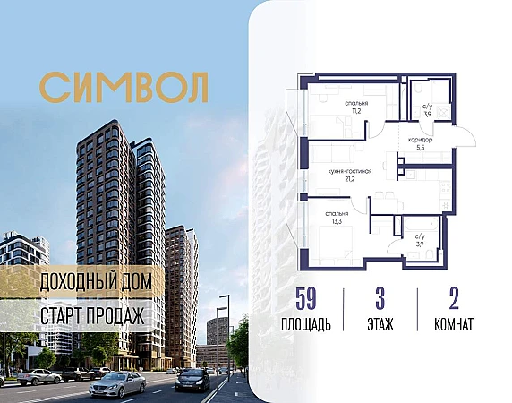 Продается 2-комнатная квартира от застройщика: общая площадь 59.00 м, жилая 24.50 м, кухня 21.20 м, 3-й этаж, жилой квартал «Гордость», корпус 40 (секция 1) . Срок сдачи: 2 квартал 2029 года.