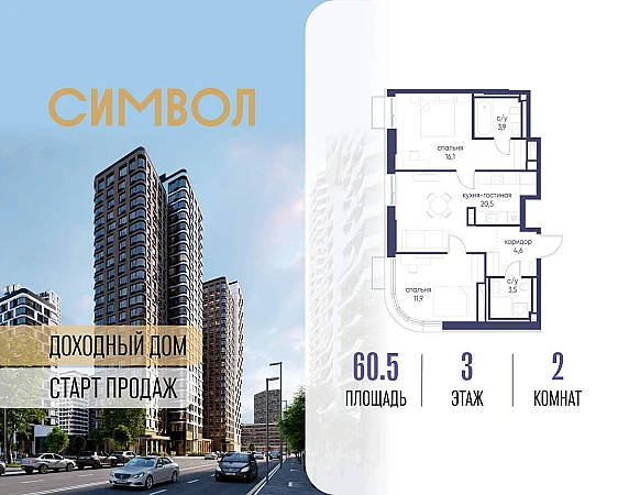 Продается 2-комнатная квартира от застройщика: общая площадь 60.50 м, жилая 28.00 м, кухня 20.50 м, 3-й этаж, жилой квартал «Гордость», корпус 40 (секция 1) . Срок сдачи: 2 квартал 2029 года.
