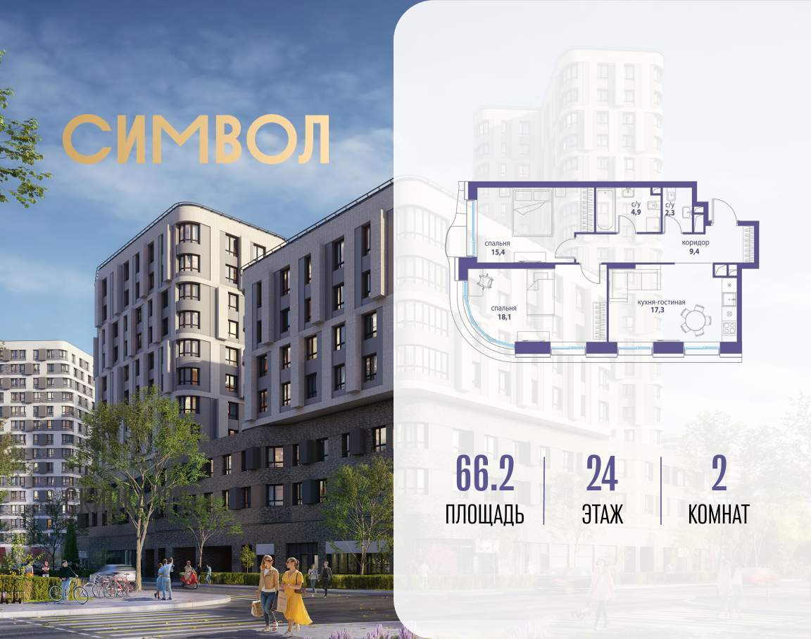 Продается 2-комнатная квартира от застройщика: общая площадь 66.20 м, жилая 33.50 м, кухня 17.30 м, 24-й этаж, жилой квартал «Вдохновение», корпус 34 (секция 1) . Срок сдачи: 4 квартал 2027 года.