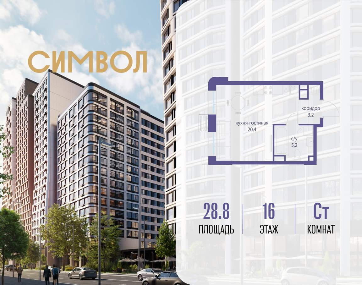 Продается квартира-студия от застройщика: общая площадь 28.80 м, жилая 10.00 м, кухня 10.40 м, 16-й этаж, жилой квартал «Гордость», корпус 36 (секция 5) . Срок сдачи: 2 квартал 2029 года.