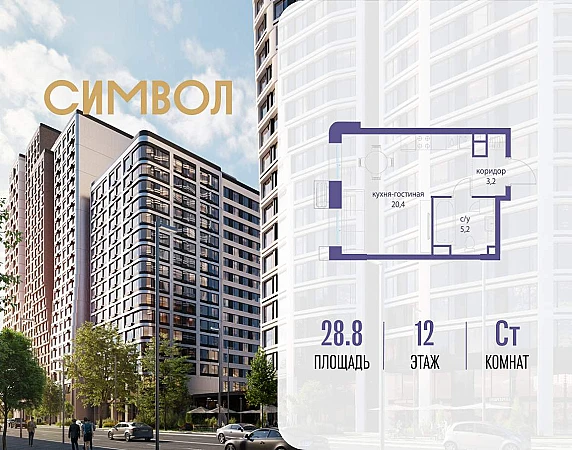 Продается квартира-студия от застройщика: общая площадь 28.80 м, жилая 10.00 м, кухня 10.40 м, 12-й этаж, жилой квартал «Гордость», корпус 36 (секция 5) . Срок сдачи: 2 квартал 2029 года.