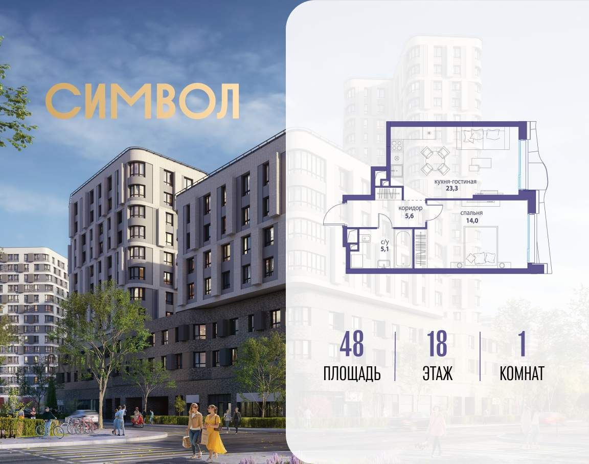 Продается 1-комнатная квартира от застройщика: общая площадь 48.00 м, жилая 14.00 м, кухня 23.30 м, 18-й этаж, жилой квартал «Вдохновение», корпус 35 (секция 1) . Срок сдачи: 4 квартал 2027 года.