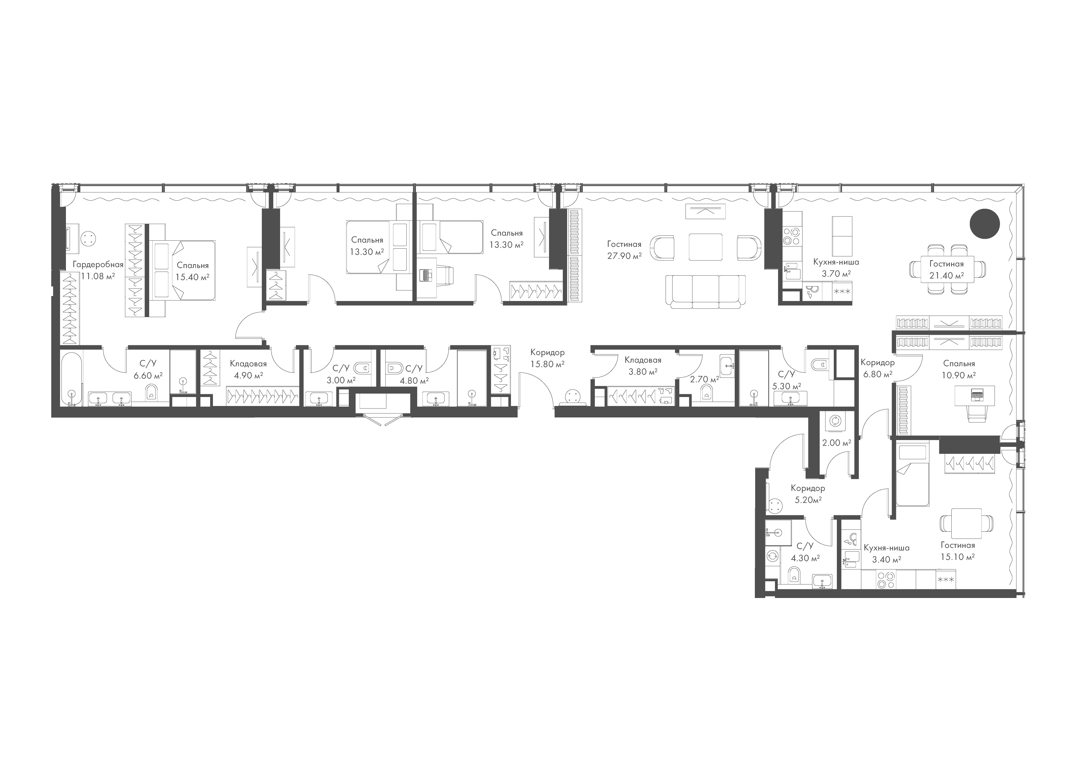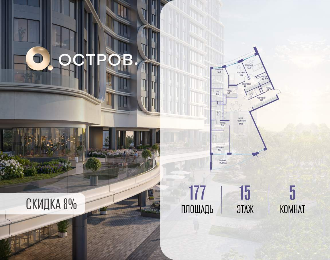 Продаётся квартира от застройщика: общая площадь 177.00 м, жилая 53.80 м, кухня 60.50 м, 15-й этаж, жилой квартал «Остров 7», корпус 3 (секция 1) . Срок сдачи: 1 квартал 2028 года.