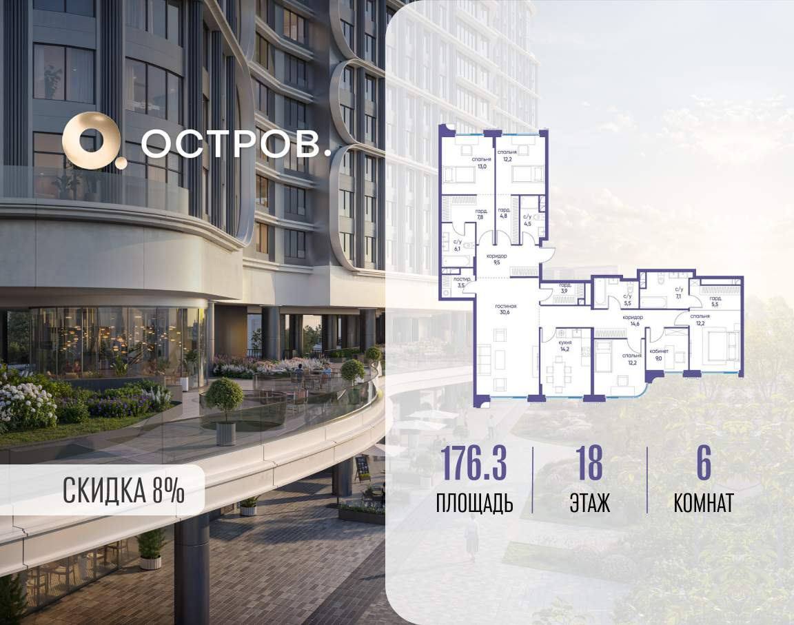 Продаётся квартира от застройщика: общая площадь 176.30 м, жилая 89.20 м, кухня 14.20 м, 18-й этаж, жилой квартал «Остров 7», корпус 2 (секция 1) . Срок сдачи: 1 квартал 2028 года.