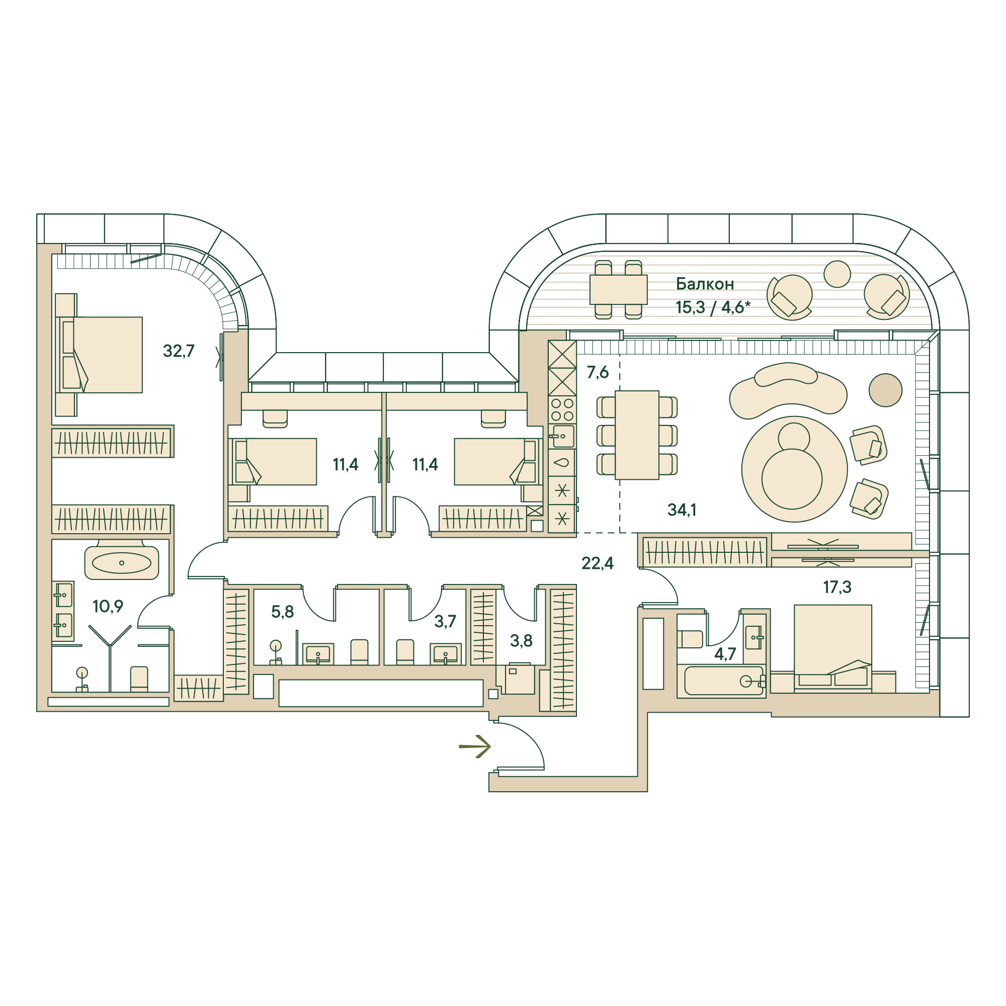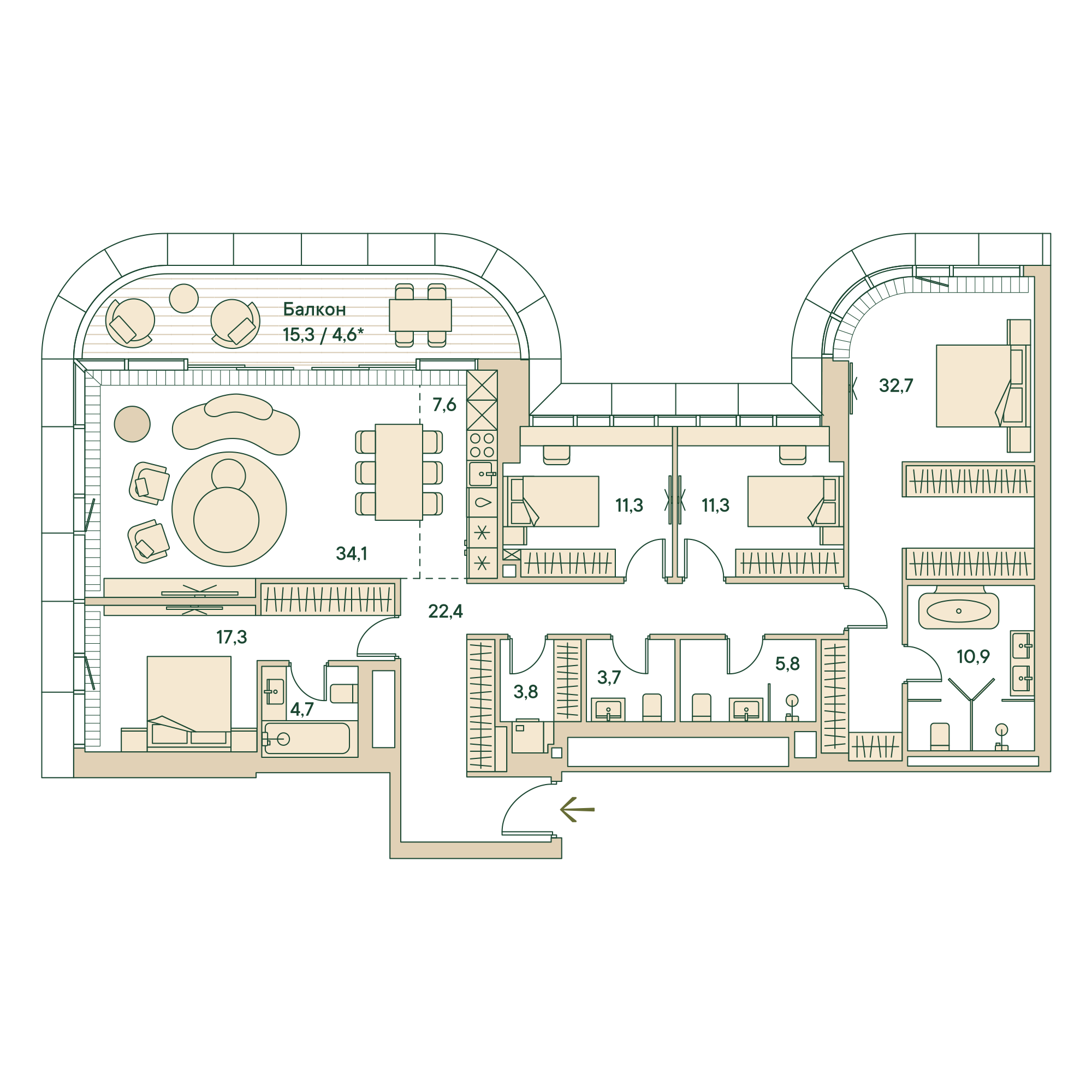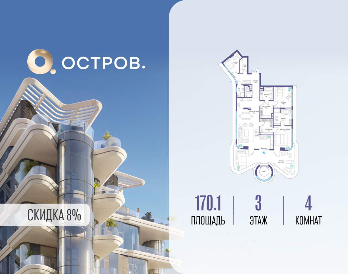 Продаётся 4-комн. квартира от застройщика: общая площадь 170.10 м, жилая 43.80 м, кухня 54.00 м, 3-й этаж, жилой квартал «Остров 10», (секция 1) . Срок сдачи: 2 квартал 2026 года.