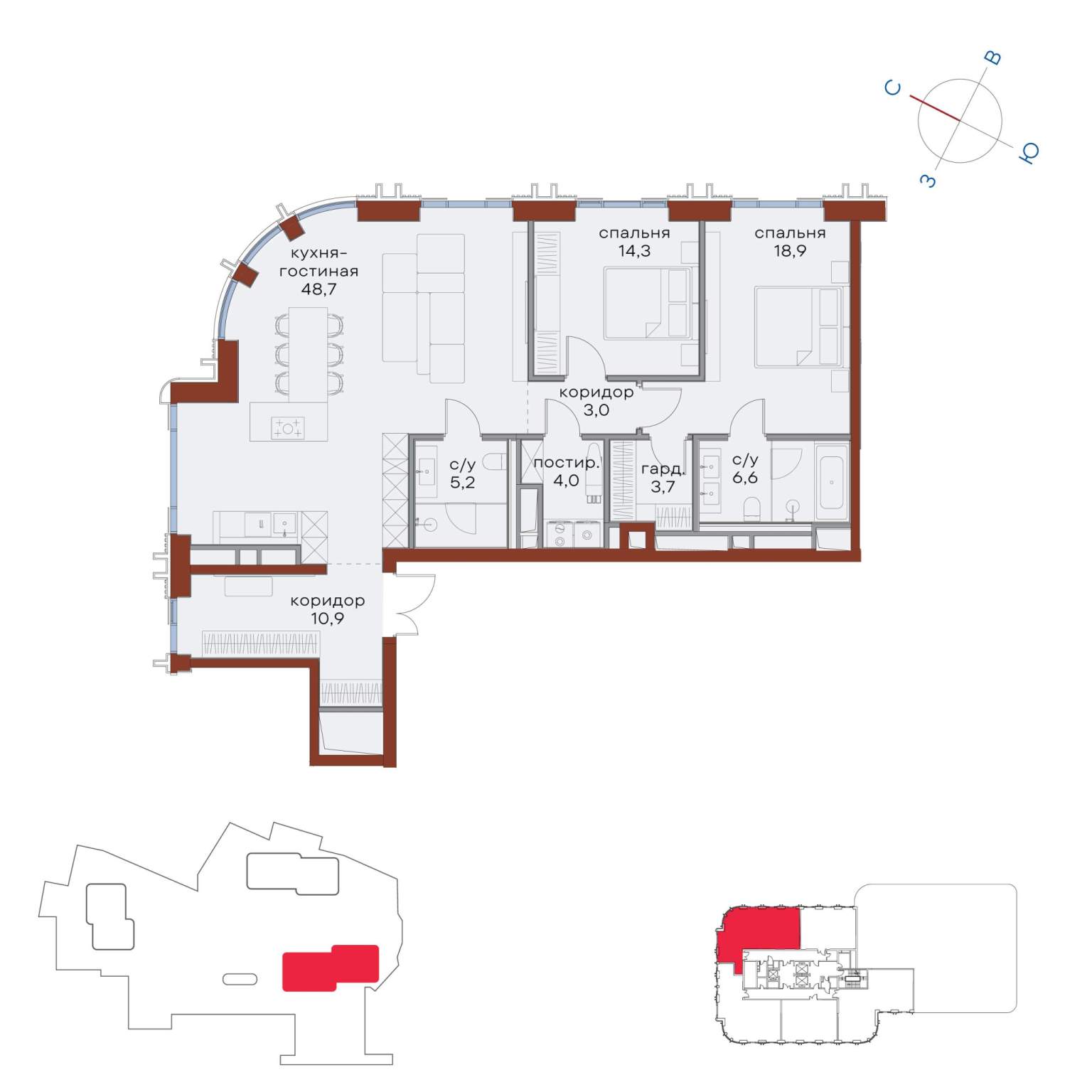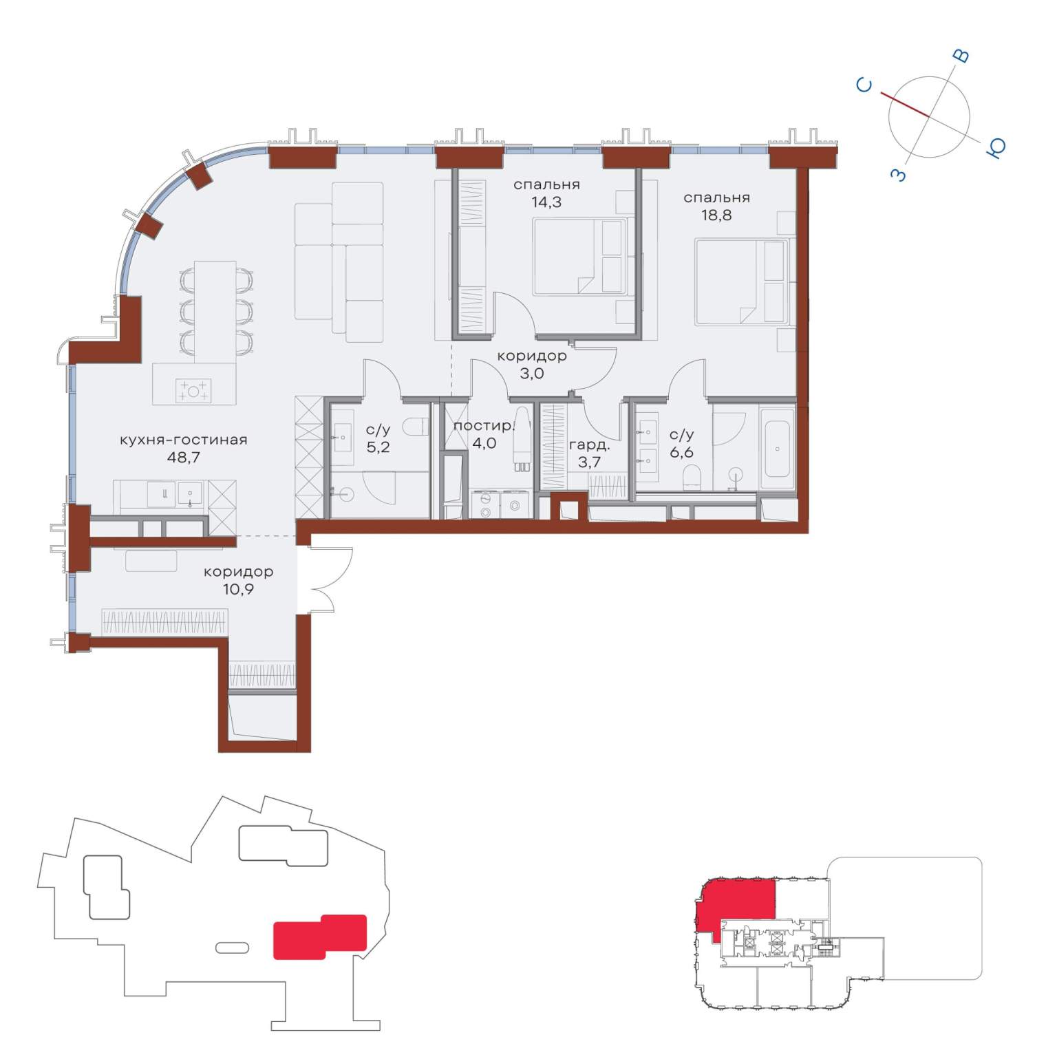 3 совмещенных санузла. В жилой зоне 2 больших окна на одну сторону, хорошая инсоляция.