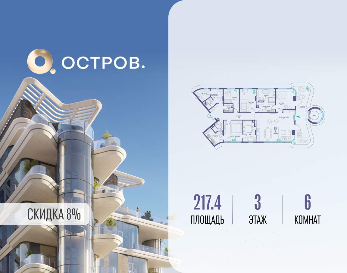 Продаётся квартира от застройщика: общая площадь 217.40 м, жилая 77.40 м, кухня 51.00 м, 3-й этаж, жилой квартал «Остров 10», (секция 1) . Срок сдачи: 2 квартал 2026 года.