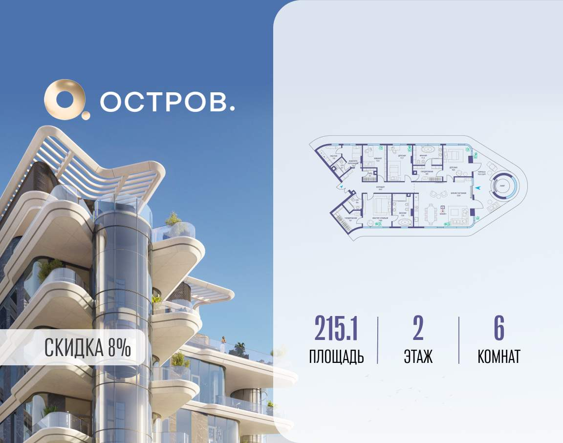 Продаётся квартира от застройщика: общая площадь 215.10 м, жилая 76.30 м, кухня 52.00 м, 2-й этаж, жилой квартал «Остров 10», (секция 1) . Срок сдачи: 2 квартал 2026 года.
