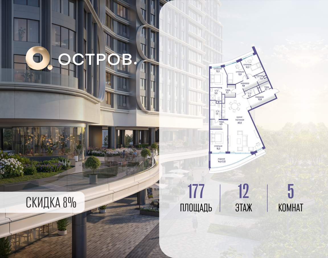 Продаётся квартира от застройщика: общая площадь 177.00 м, жилая 53.80 м, кухня 60.50 м, 12-й этаж, жилой квартал «Остров 7», корпус 3 (секция 1) . Срок сдачи: 1 квартал 2028 года.