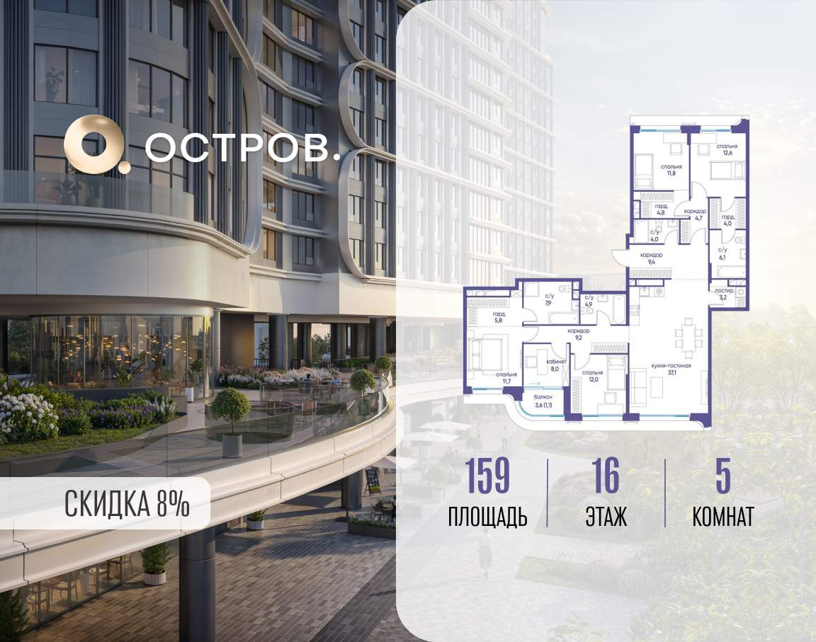 Продаётся квартира от застройщика: общая площадь 159.00 м, жилая 56.10 м, кухня 37.10 м, 16-й этаж, жилой квартал «Остров 7», корпус 2 (секция 3) . Срок сдачи: 1 квартал 2028 года.