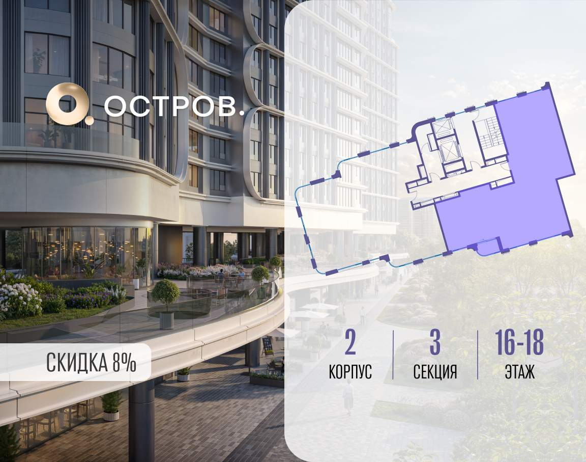 ОСТРОВ от Донстрой - жилой комплекс на западе Москвы, в Мневниковской пойме. Уникальное преимущество комплекса - в том, что он обособлен от города рекой и природным парком (650 га) . Благодаря природному окружению эта территория имеет лучший экологический рейтинг в столице. Кварталы ОСТРОВА объединены ландшафтным дизайном в единое пространство - с набережными и Центральным бульваром. На ОСТРОВЕ любые объекты, необходимые для полноценной жизни и отдыха, находятся на расстоянии 15-минутной прогулки. Торговый центр и супермаркеты, кафе и рестораны, фитнес, салоны красоты, школы и детские сады. А также крупнейший в Москве спортивный кластер.