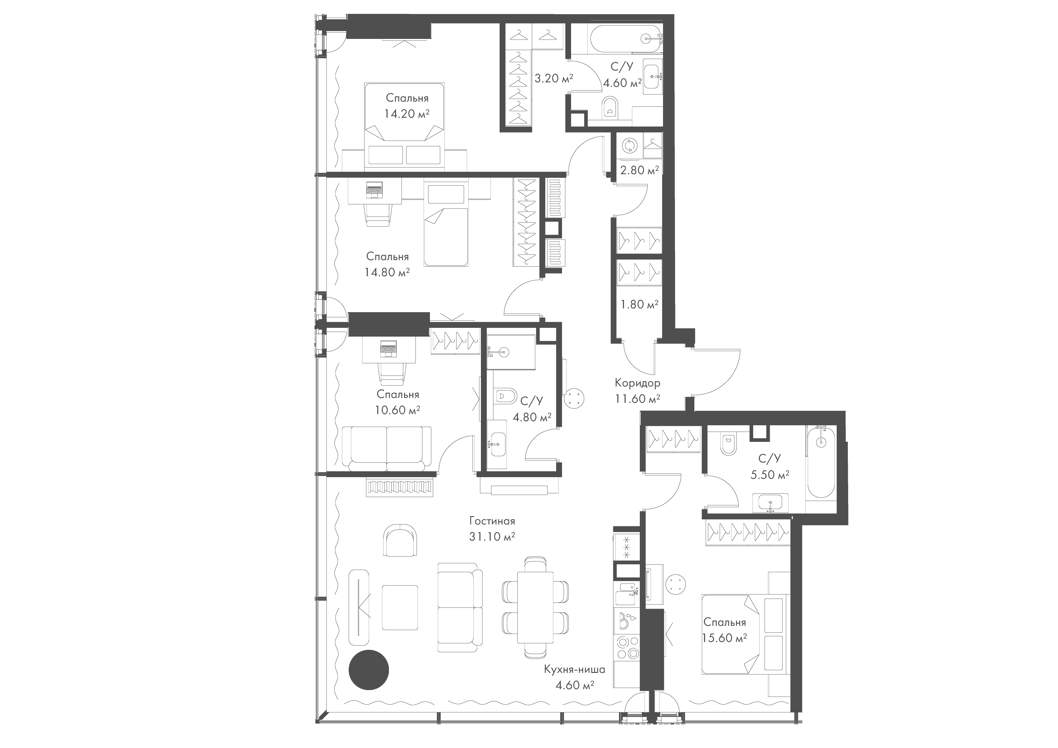 3 совмещенных санузла. В жилой зоне 2 больших окна на одну сторону, хорошая инсоляция.