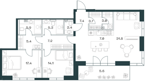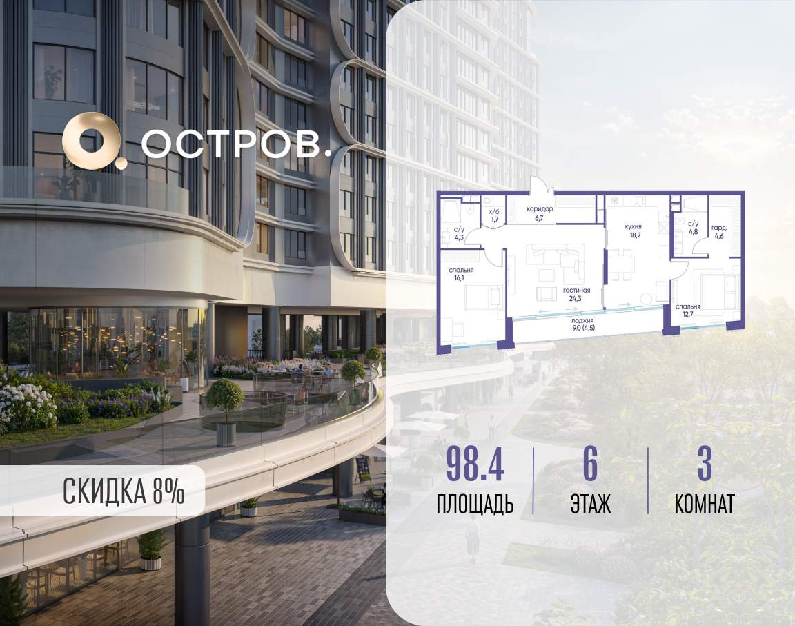 Продаётся 3-комн. квартира от застройщика: общая площадь 98.40 м, жилая 53.10 м, кухня 18.70 м, 6-й этаж, жилой квартал «Остров 7», корпус 4 (секция 1) . Срок сдачи: 1 квартал 2028 года.