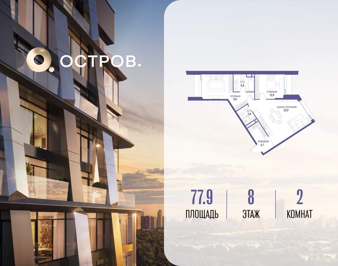 Продаётся 2-комн. квартира от застройщика: общая площадь 77.90 м, жилая 30.70 м, кухня 30.90 м, 8-й этаж, жилой квартал «Остров 12», корпус 1 (секция 1) . Срок сдачи: 1 квартал 2029 года.