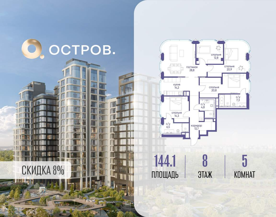 Продаётся квартира от застройщика: общая площадь 144.10 м, жилая 97.60 м, кухня 14.20 м, 8-й этаж, жилой квартал «Остров 12», корпус 2 (секция 1) . Срок сдачи: 1 квартал 2029 года.