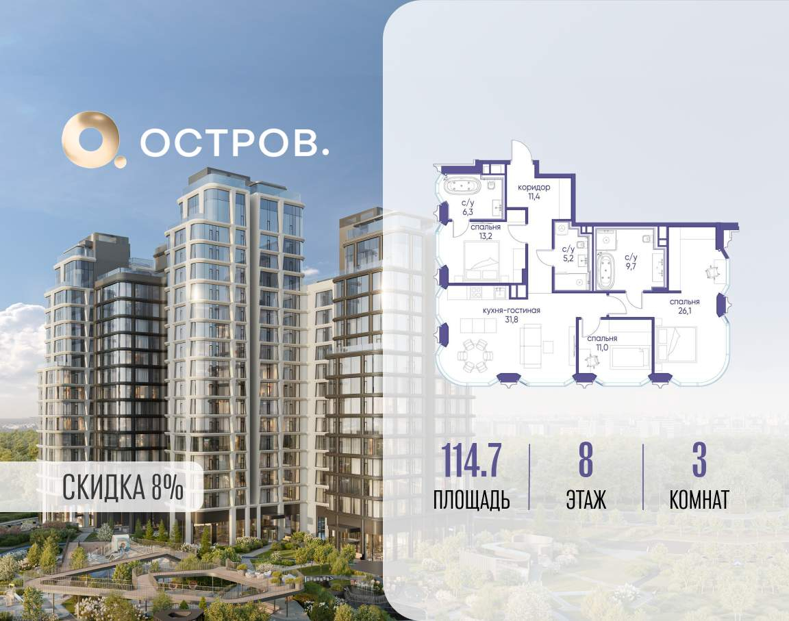 Продаётся 3-комн. квартира от застройщика: общая площадь 114.70 м, жилая 50.30 м, кухня 31.80 м, 8-й этаж, жилой квартал «Остров 12», корпус 2 (секция 1) . Срок сдачи: 1 квартал 2029 года.