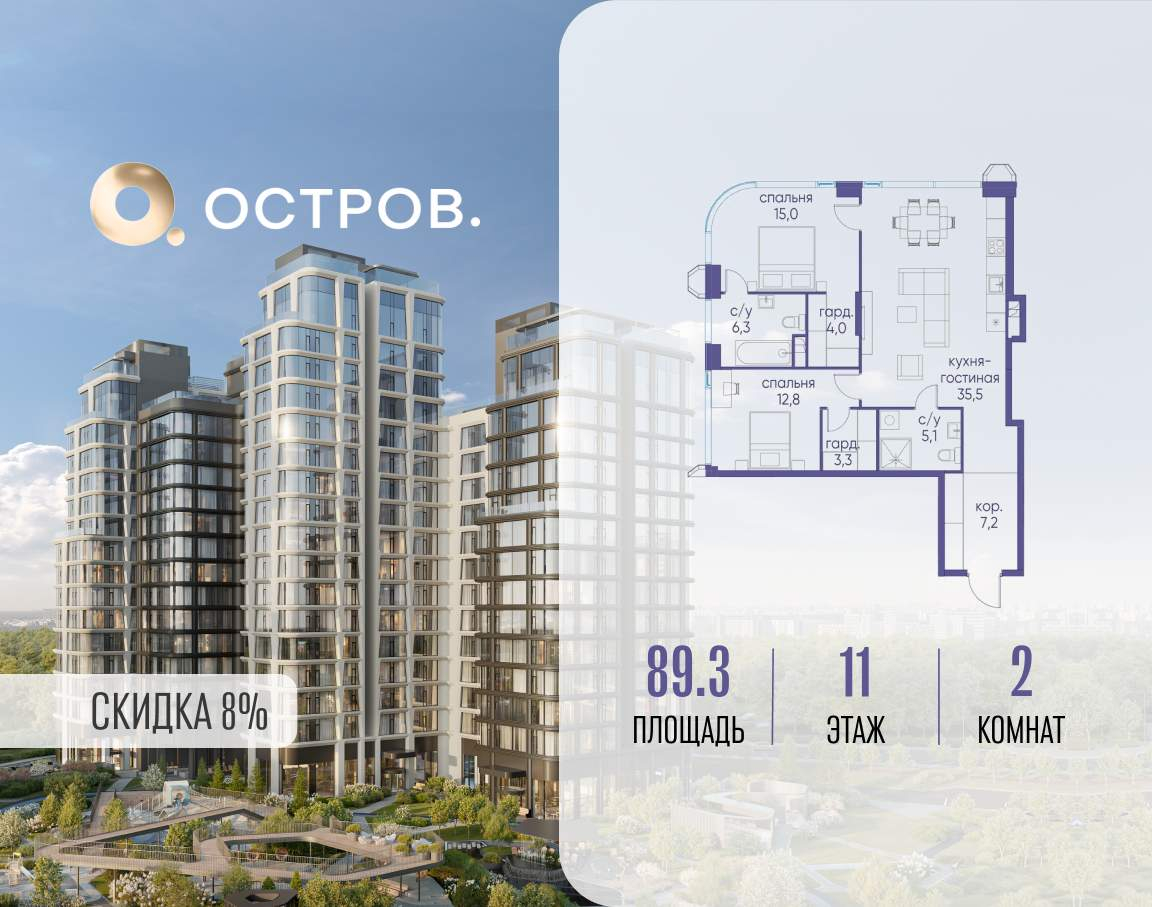 Продаётся 2-комн. квартира от застройщика: общая площадь 89.30 м, жилая 27.80 м, кухня 35.50 м, 11-й этаж, жилой квартал «Остров 12», корпус 1 (секция 2) . Срок сдачи: 1 квартал 2029 года.