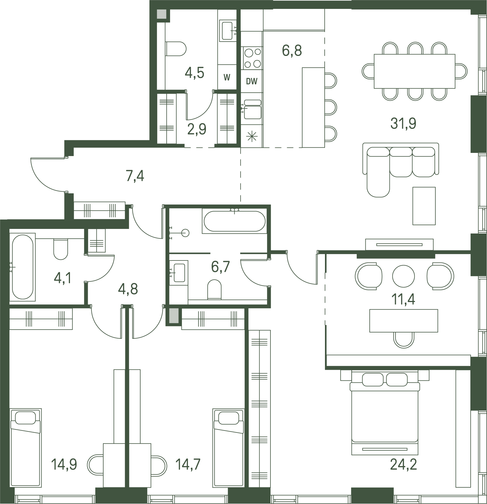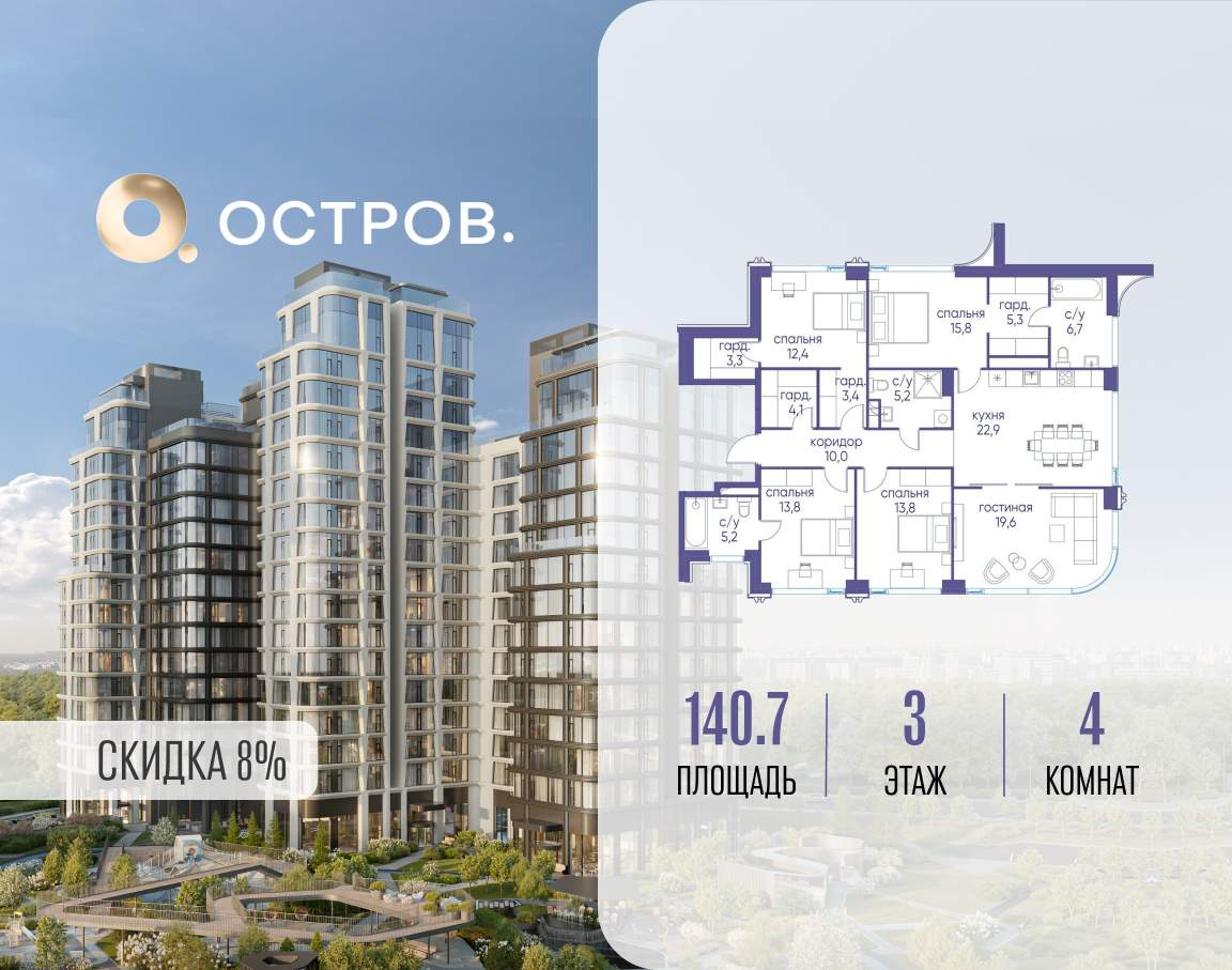 Продаётся 4-комн. квартира от застройщика: общая площадь 140.70 м, жилая 55.80 м, кухня 42.50 м, 3-й этаж, жилой квартал «Остров 12», корпус 1 (секция 1) . Срок сдачи: 1 квартал 2029 года.