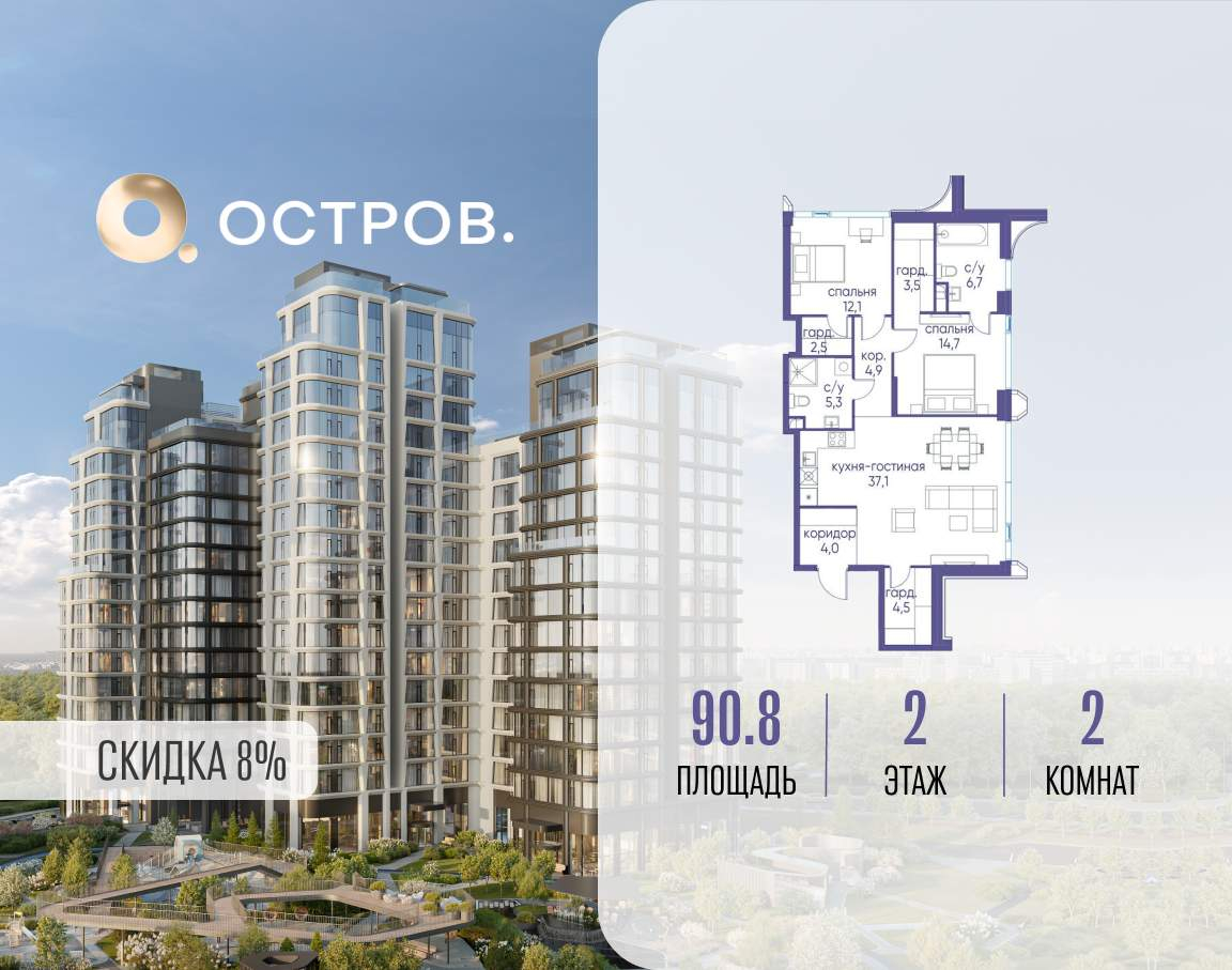 Продаётся 2-комн. квартира от застройщика: общая площадь 90.80 м, жилая 26.80 м, кухня 37.10 м, 2-й этаж, жилой квартал «Остров 12», корпус 1 (секция 2) . Срок сдачи: 1 квартал 2029 года.