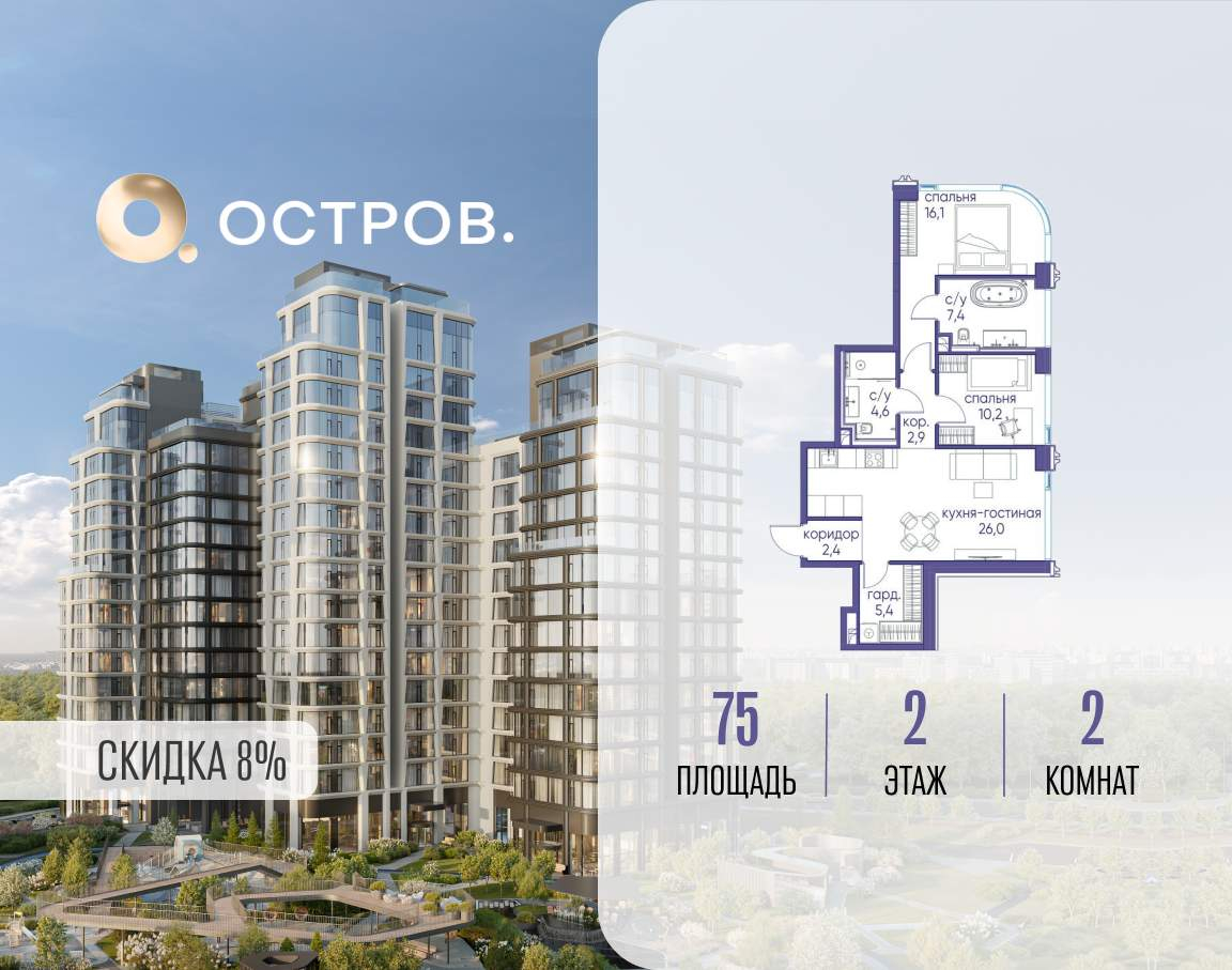 Продаётся 2-комн. квартира от застройщика: общая площадь 75.00 м, жилая 26.30 м, кухня 26.00 м, 2-й этаж, жилой квартал «Остров 12», корпус 1 (секция 3) . Срок сдачи: 1 квартал 2029 года.