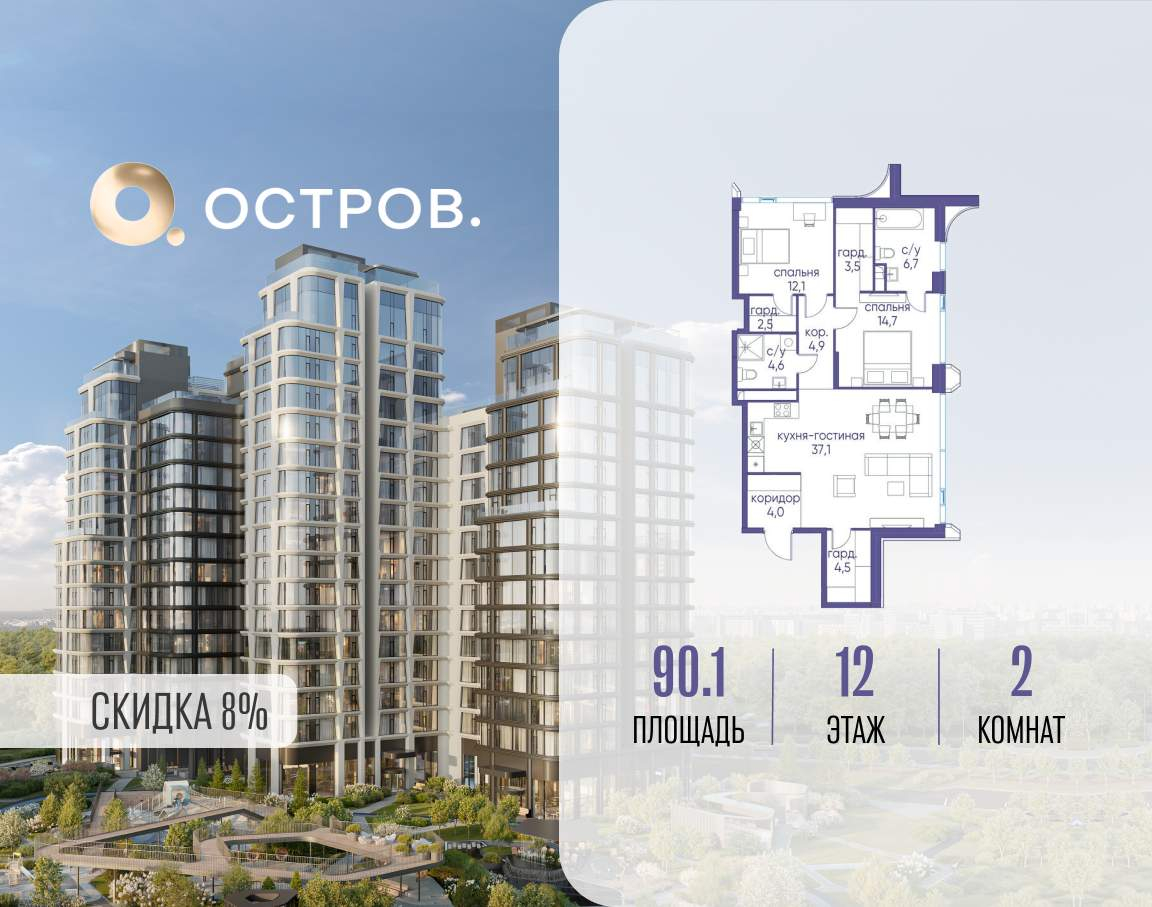 Продаётся 2-комн. квартира от застройщика: общая площадь 90.10 м, жилая 26.80 м, кухня 37.10 м, 12-й этаж, жилой квартал «Остров 12», корпус 1 (секция 2) . Срок сдачи: 1 квартал 2029 года.