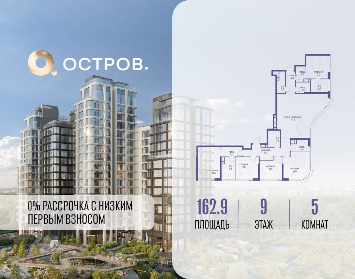 Продаётся квартира от застройщика: общая площадь 162.90 м, жилая 65.60 м, кухня 41.20 м, 9-й этаж, жилой квартал «Остров 12», корпус 3 (секция 1) . Срок сдачи: 1 квартал 2029 года.