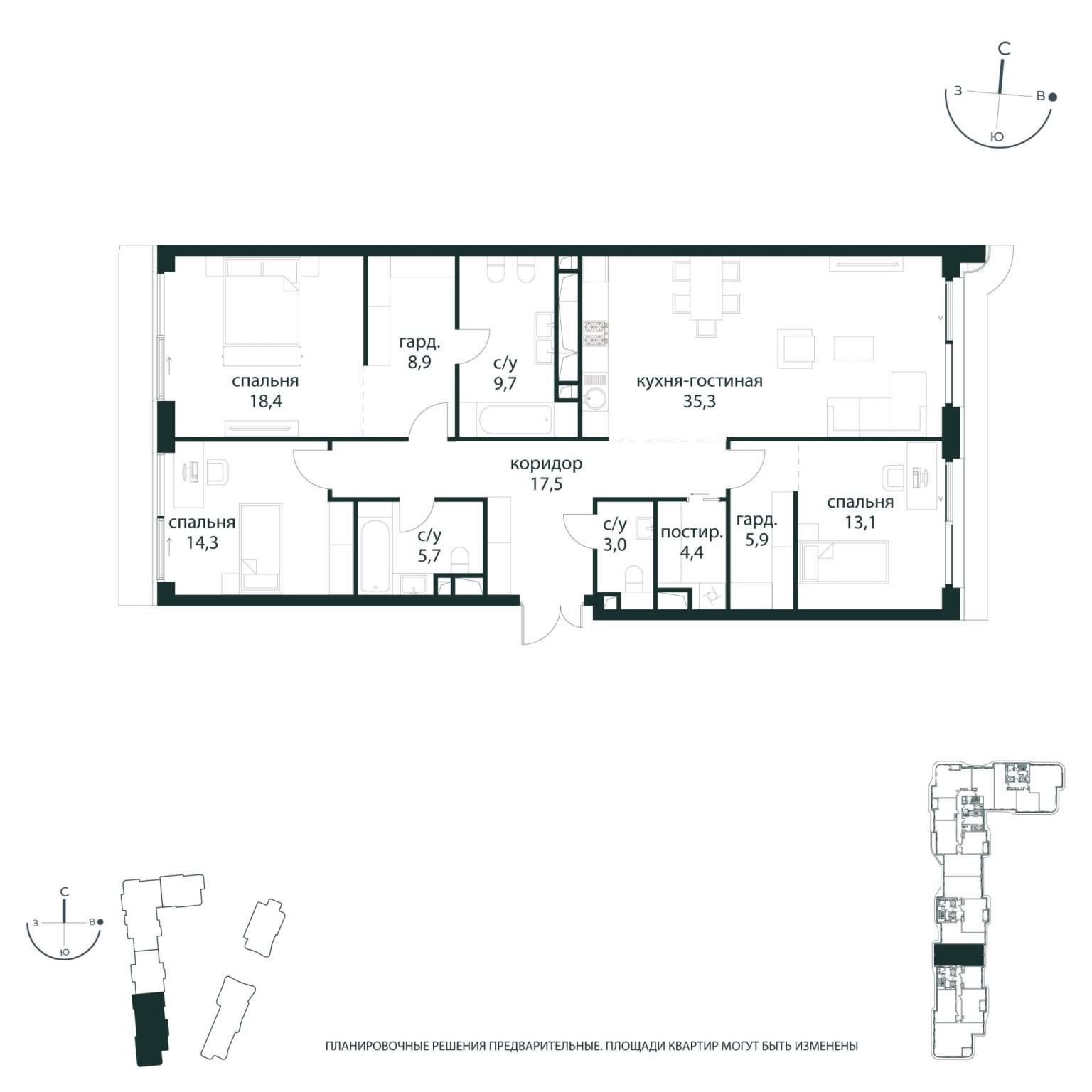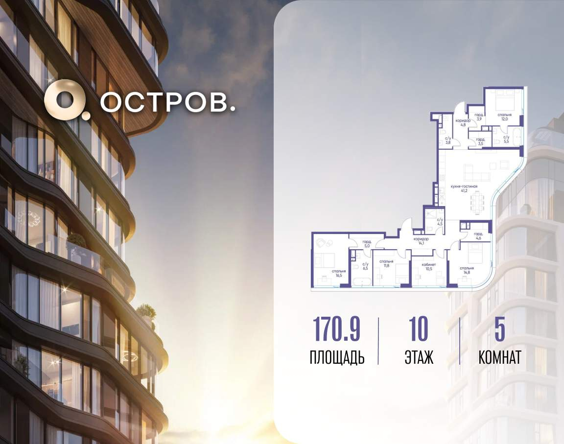 Продаётся квартира от застройщика: общая площадь 170.90 м, жилая 65.60 м, кухня 41.20 м, 10-й этаж, жилой квартал «Остров 12», корпус 3 (секция 1) . Срок сдачи: 1 квартал 2029 года.