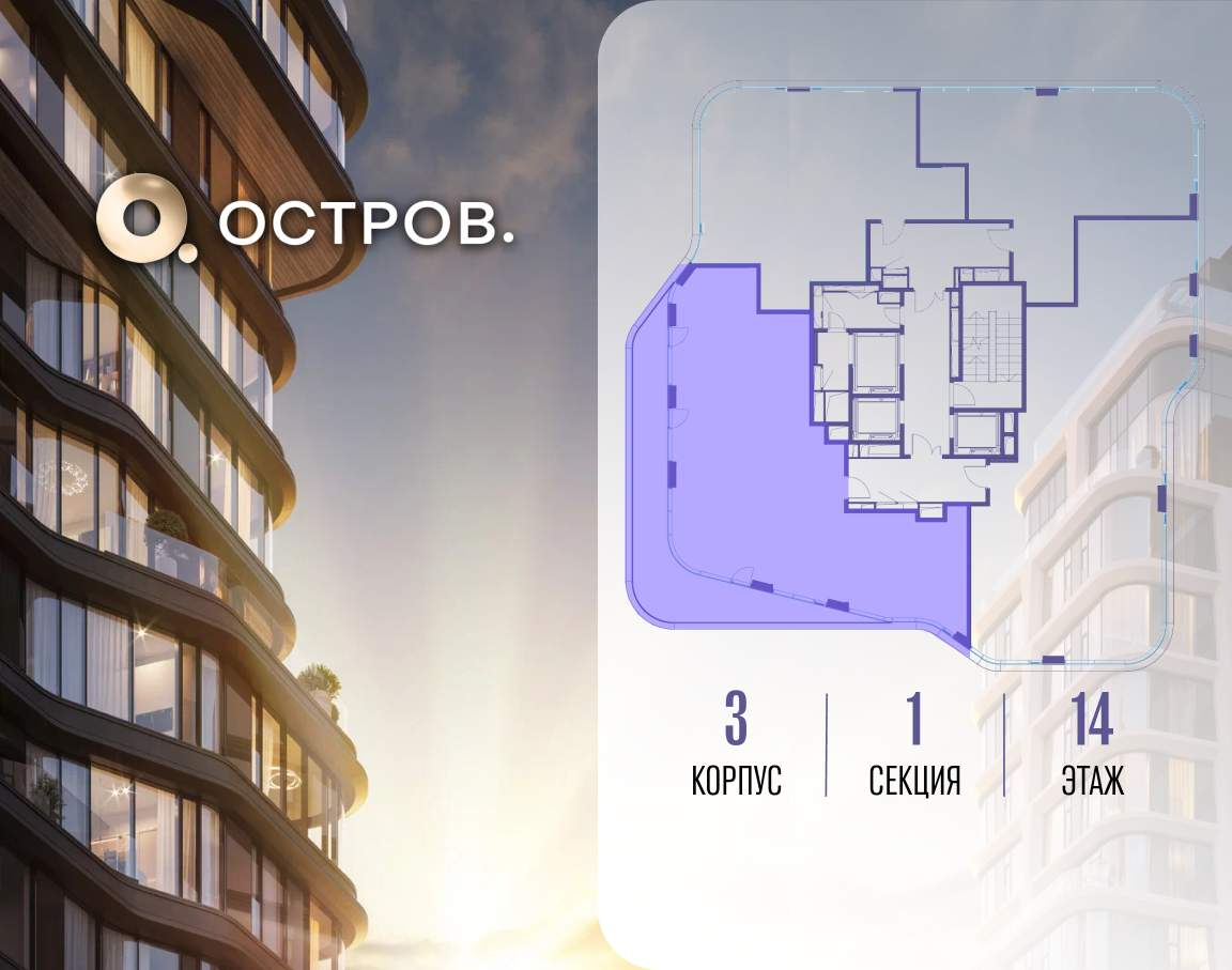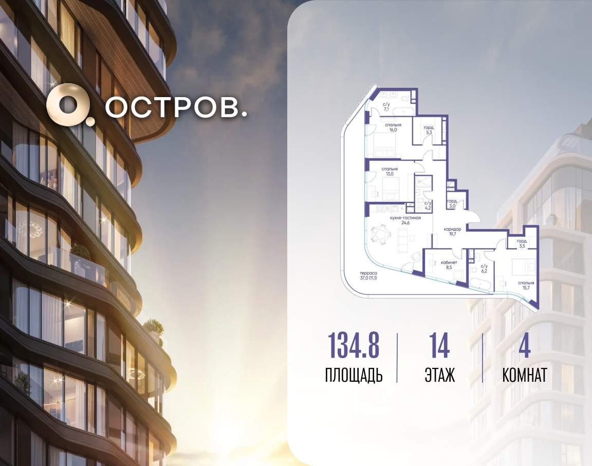 Продаётся 4-комн. квартира от застройщика: общая площадь 134.80 м, жилая 53.30 м, кухня 24.60 м, 14-й этаж, жилой квартал «Остров 12», корпус 3 (секция 1) . Срок сдачи: 1 квартал 2029 года.