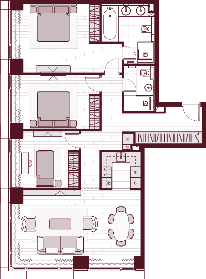 3 совмещенных санузла. В жилой зоне 2 больших окна на одну сторону, хорошая инсоляция.