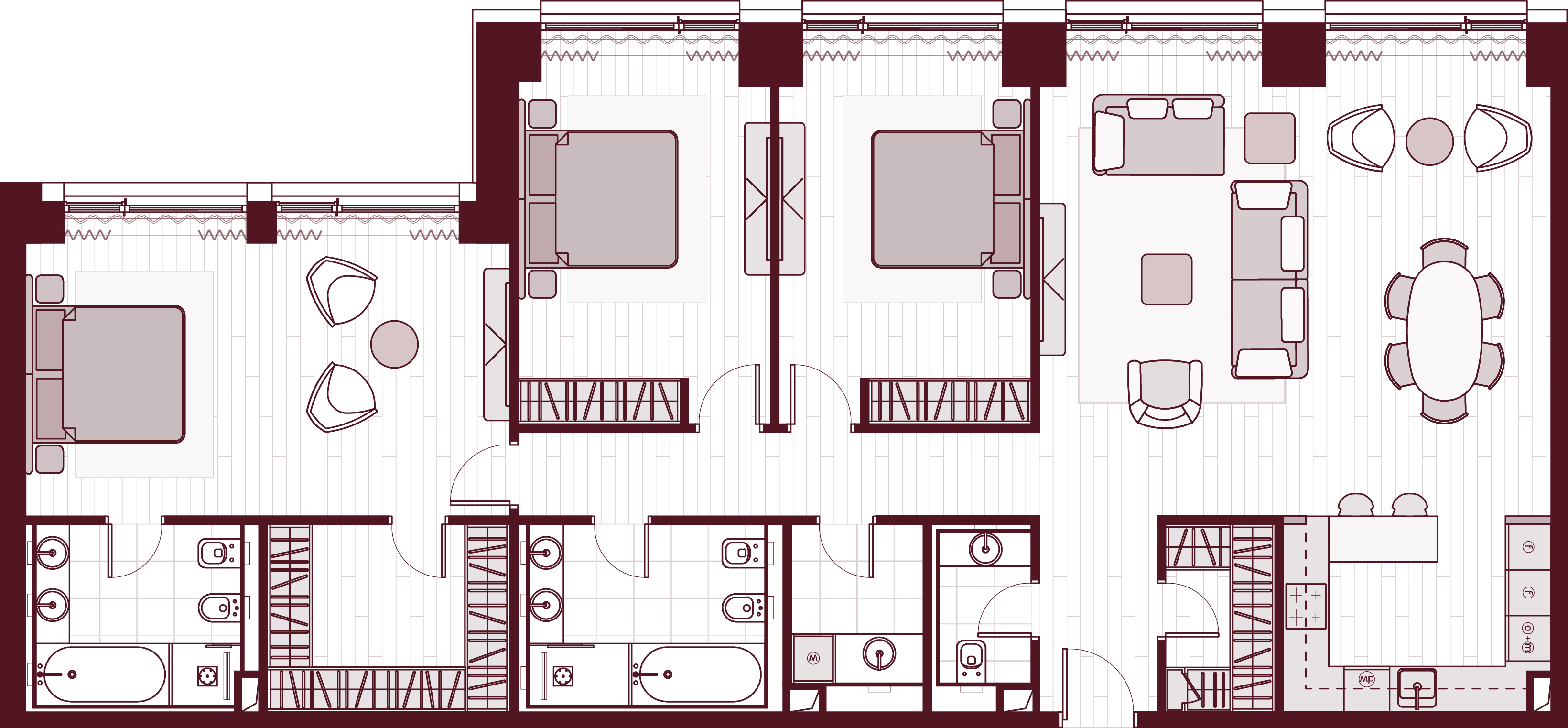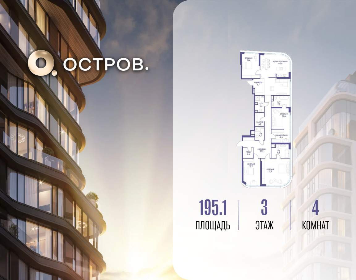Продаётся 4-комн. квартира от застройщика: общая площадь 195.10 м, жилая 75.40 м, кухня 40.40 м, 3-й этаж, жилой квартал «Остров 12», корпус 6 (секция 1) . Срок сдачи: 1 квартал 2029 года.