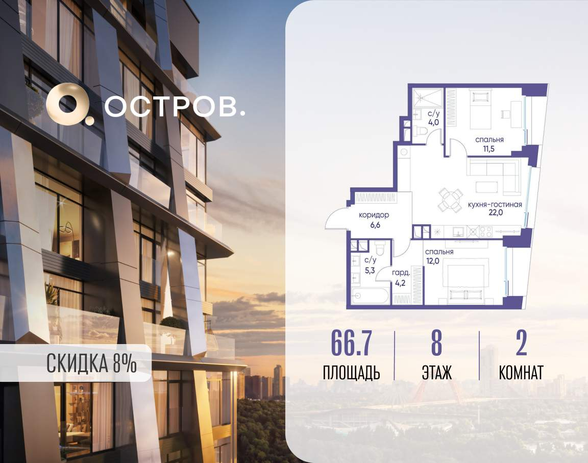 Продаётся 2-комн. квартира от застройщика: общая площадь 66.70 м, жилая 23.50 м, кухня 22.00 м, 8-й этаж, жилой квартал «Остров 12», корпус 1 (секция 2) . Срок сдачи: 1 квартал 2029 года.