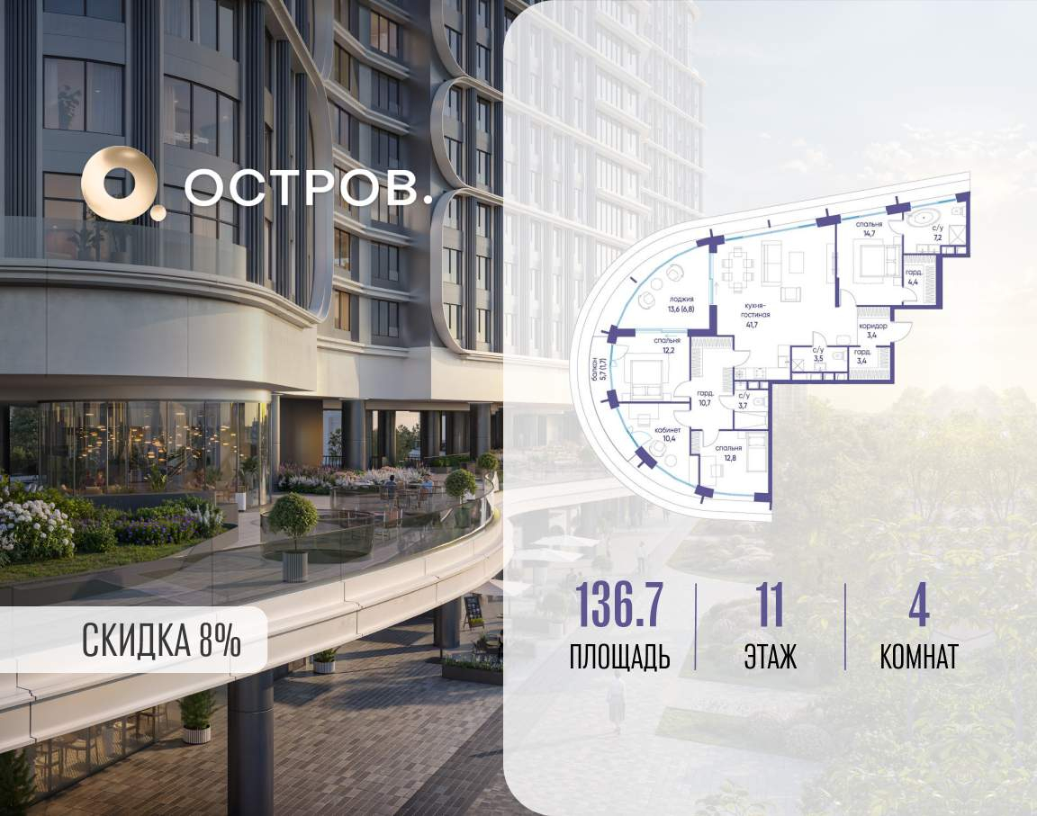 Продаётся 4-комн. квартира от застройщика: общая площадь 136.70 м, жилая 37.36 м, кухня 41.70 м, 11-й этаж, жилой квартал «Остров 7», корпус 5 (секция 2) . Срок сдачи: 3 квартал 2028 года.