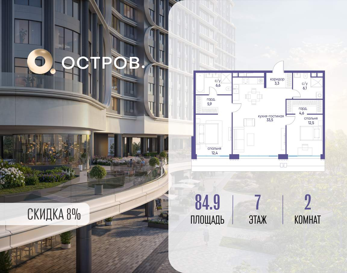 Продаётся 2-комн. квартира от застройщика: общая площадь 84.90 м, жилая 24.90 м, кухня 33.50 м, 7-й этаж, жилой квартал «Остров 7», корпус 6 (секция 1) . Срок сдачи: 3 квартал 2028 года.