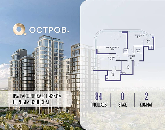 Продаётся 2-комн. квартира от застройщика: общая площадь 84.00 м, жилая 28.70 м, кухня 27.60 м, 8-й этаж, жилой квартал «Остров 12», корпус 6 (секция 1) . Срок сдачи: 1 квартал 2029 года.