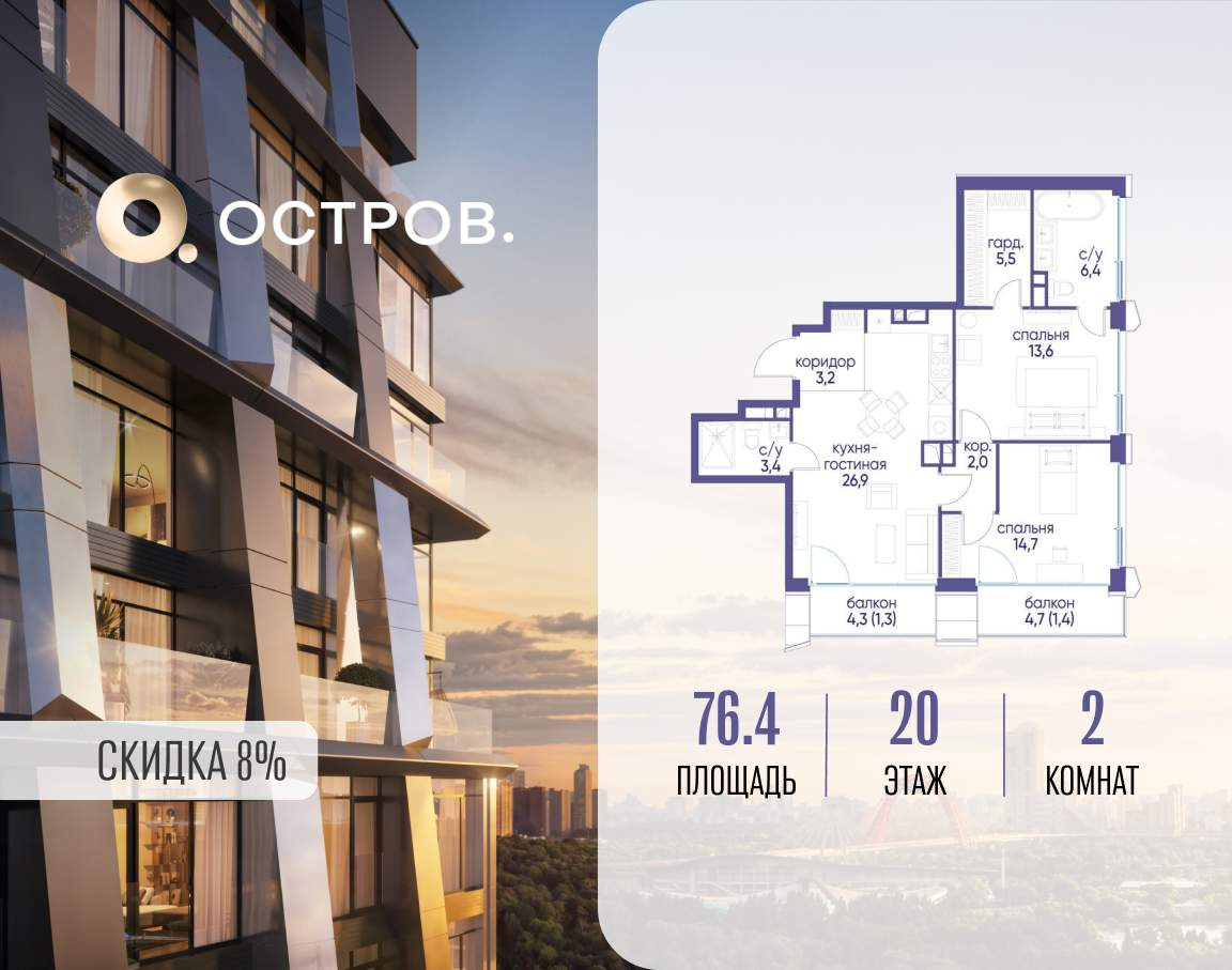 Продаётся 2-комн. квартира от застройщика: общая площадь 76.40 м, жилая 28.30 м, кухня 26.90 м, 20-й этаж, жилой квартал «Остров 12», корпус 3 (секция 1) . Срок сдачи: 1 квартал 2029 года.