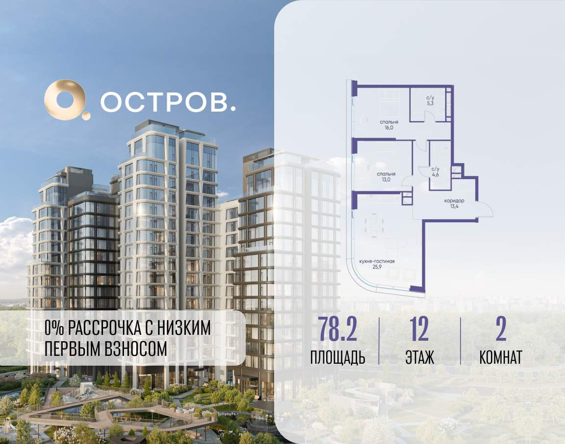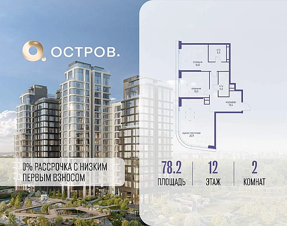 Продаётся 2-комн. квартира от застройщика: общая площадь 78.20 м, жилая 29.00 м, кухня 25.90 м, 12-й этаж, жилой квартал «Остров 12», корпус 3 (секция 1) . Срок сдачи: 1 квартал 2029 года.