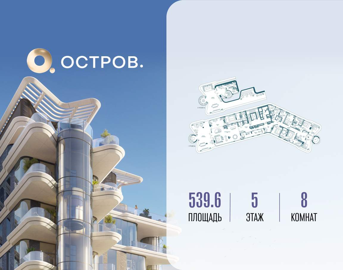Продаётся квартира от застройщика: общая площадь 539.60 м, жилая 163.80 м, кухня 107.40 м, 5-й этаж, жилой квартал «Остров 10», (секция 1) . Срок сдачи: 2 квартал 2026 года.