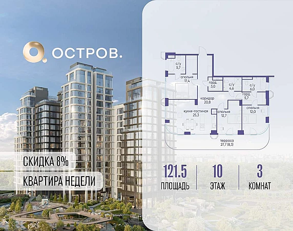 Продаётся 3-комн. квартира от застройщика: общая площадь 121.50 м, жилая 42.10 м, кухня 25.30 м, 10-й этаж, жилой квартал «Остров 12», корпус 1 (секция 1) . Срок сдачи: 1 квартал 2029 года.