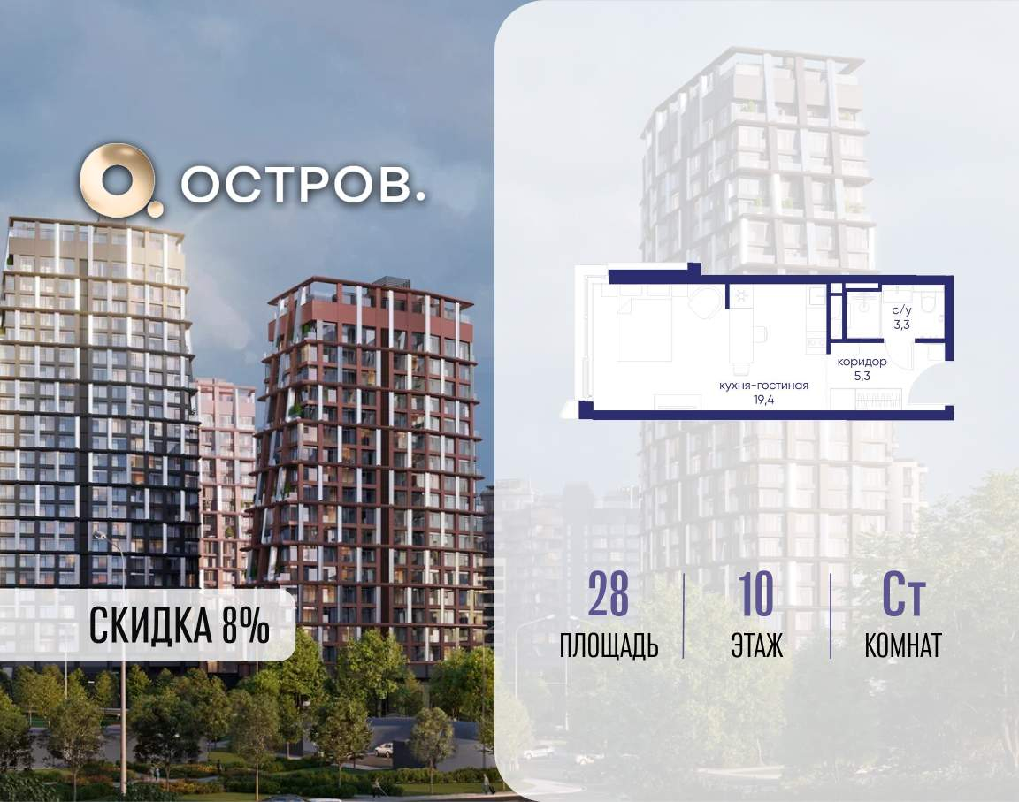 Продаётся квартира от застройщика: общая площадь 28.00 м, жилая 14.40 м, кухня 5.00 м, 10-й этаж, жилой квартал «Остров 14», корпус 1 (секция 1) . Срок сдачи: 2 квартал 2029 года.