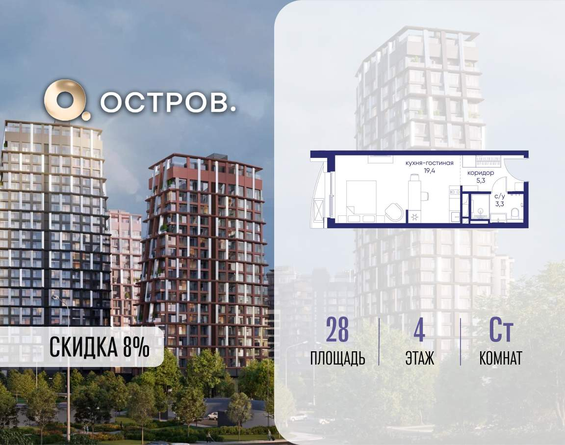 Продаётся квартира от застройщика: общая площадь 28.00 м, жилая 14.40 м, кухня 5.00 м, 4-й этаж, жилой квартал «Остров 14», корпус 1 (секция 2) . Срок сдачи: 2 квартал 2029 года.