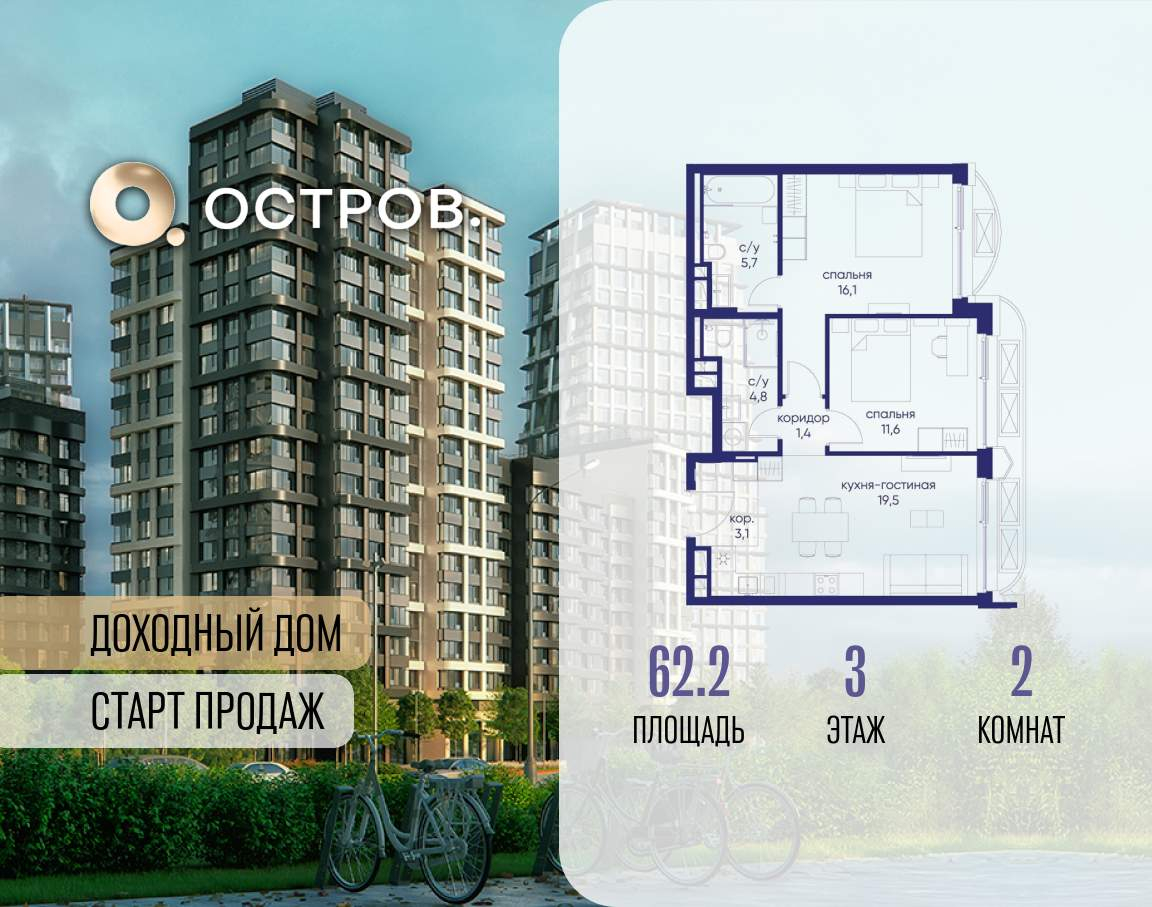 Продаётся 2-комн. квартира от застройщика: общая площадь 62.20 м, жилая 27.70 м, кухня 19.50 м, 3-й этаж, жилой квартал «Остров 14», корпус 1 (секция 1) . Срок сдачи: 2 квартал 2029 года.