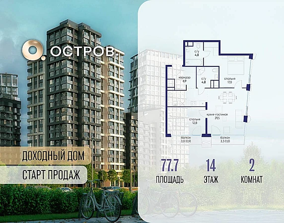 Продаётся 2-комн. квартира от застройщика: общая площадь 77.70 м, жилая 29.80 м, кухня 29.50 м, 14-й этаж, жилой квартал «Остров 14», корпус 6 (секция 1) . Срок сдачи: 2 квартал 2029 года.