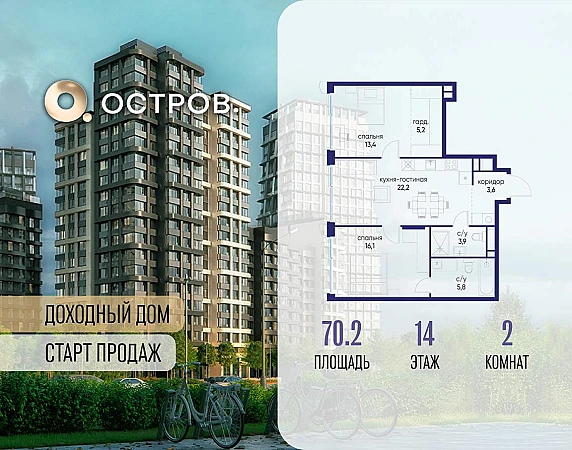 Продаётся 2-комн. квартира от застройщика: общая площадь 70.20 м, жилая 29.50 м, кухня 22.20 м, 14-й этаж, жилой квартал «Остров 14», корпус 6 (секция 1) . Срок сдачи: 2 квартал 2029 года.